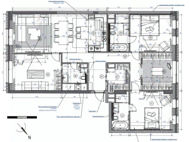 Предполагается комфортное размещение кухни - гостиной,четырех, пяти спален, три санузла, 2-х гардеробных.