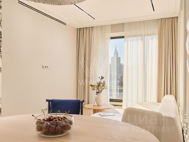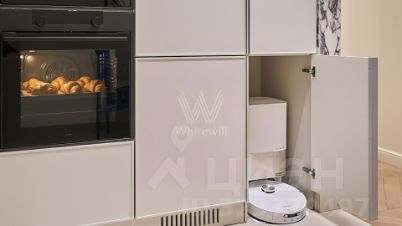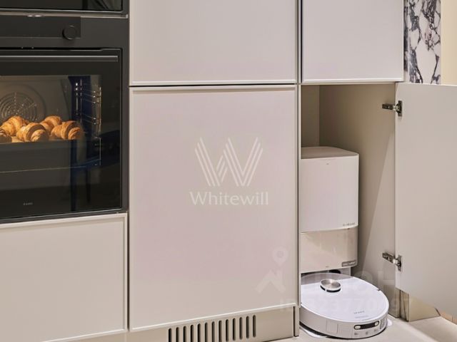 Квартира оборудована системой "умный дом" — BUS77 с управлением светом по протоколу Dali и моющим пылесосом Dreame Bot с подключением к водопроводу и системе канализации. Функциональная планировка включает кухню-гостиную, мастер-спальню с собственной ванной комнатой и гардеробной, две спальни, кабинет, санузел, две гардеробные, постирочную и холл. Из панорамных окон открываются виды на комплекс "Триумф-Палас" и благоустроенный двор.