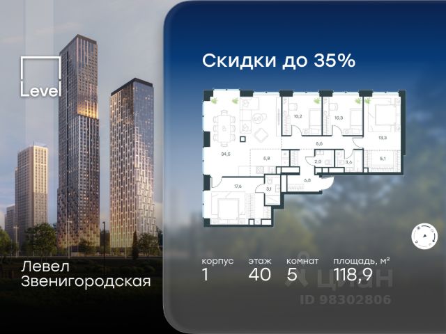 Цена указана с учётом скидки при 100%-й оплате, несубсидированной ипотеке, рассрочке (кроме программы "Рассрочка 0%"). В жилом квартале продаётся многокомнатная квартира площадью 116.80 кв.м white box. Квартира расположена на 33 этаже 48 этажного корпуса 1 в жилом комплексе комфорт класса Левел Звенигородская (компания Level Group/Левел групп). Отличная транспортная доступность - 5 мин. пешком до метро "Звенигородская" (откроется к окончанию строительства); - 18 мин. пешком до станции МЦК "Хорошёво" и станции БКЛ "Народное ополчение"; - 4 мин. на авто до ТТК; - 8 мин. на авто до Садового кольца; - 15 мин. на авто до Кремля. Продуманный архитектурный проект - Концепция от студии Станислава Михаловского, в основу которой легло единение природы и города; - Двухкамерные стеклопакеты в окнах, алюминиевый и ПВХ профиль - в квартирах тепло зимой и прохладно летом; - С верхних этажей откроются панорамные виды на город, Москву-реку, "Москва-Сити" и Москворецкий парк; - Лобби со всеми удобствами: окна в пол, высокие потолки до 4,7 м, лаунж-зоны, колясочные, гостевые санузлы и мойки для лап животных; - Централизованные водонагреватели гарантируют круглогодичную подачу горячей воды в каждую квартиру. Благоустройство Концепция благоустройства разработана совместно с бюро UNK landscape. Высота башен приближается к 200 метрам - они словно касаются неба. Небесный простор проецируется на территорию двора с помощью подсветки, визуально увеличивая пространство и отражаясь в авторских элементах архитектуры. На территории площадью 0,45 га расположатся: - "Облако событий" - место встреч и общения; - "Облако спорта" - всё для поддержания себя в форме; - "Облако принятия решений" - пространство для работы на свежем воздухе; - "Облако спокойствия" - для отдыха в тишине природы; - "Облако игр" - площадки для подростков и самых маленьких. Инфраструктура В жилом комплексе откроется 21 коммерческое помещение: продуктовые лавки, кафе, салоны красоты, службы доставки и творческие студии. Этап 1 включает строительство двухуровневого подземного паркинга. Всего здесь расположится 351 машино-место, включая семейные места, и 264 кладовых помещения. В распоряжении жителей развитая инфраструктура района: 15 супермаркетов, 5 спортивных объектов, 9 медучреждений, 7 детских садов, 4 школы, 3 благоустроенных парка - всё в шаговой доступности. Инженерия Комфортное перемещение внутри домов будут обеспечивать надёжные лифты с доступом в паркинг с жилых этажей. В каждом корпусе предусмотрено до шести кабин, включая сервисные лифты. Попасть на территорию комплекса можно только по единому ключу доступа. Видеонаблюдение установлено на входах в подъезды, в лобби, в общих зонах, на въезде в паркинг. Гости смогут связаться с жителями дома через входные видеопанели, а управлять доступом на территорию можно через видеодомофон или приложение на телефоне.