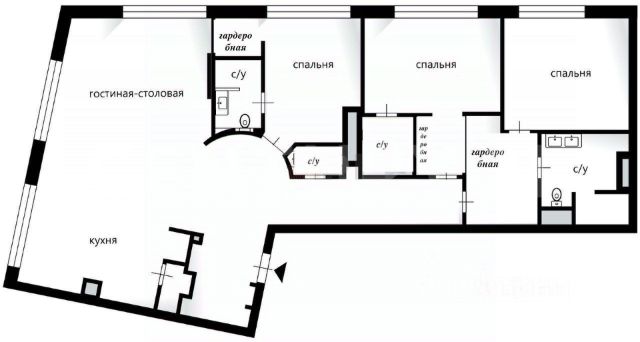 В квартире 511,6 кв. м (560 кв. м с учетом летних помещений). Удобная планировка включает в себя: просторный гостевой зал 185 кв.м., 5 спален, кабинет, кинотеатр, зимний сад, комнату отдыха, библиотеку с камином, кухню, столовую, 3 ванных комнаты и гостевой санузел, гардеробные и кладовые, постирочную и технические помещения.