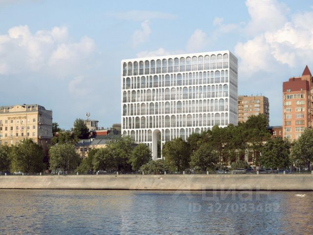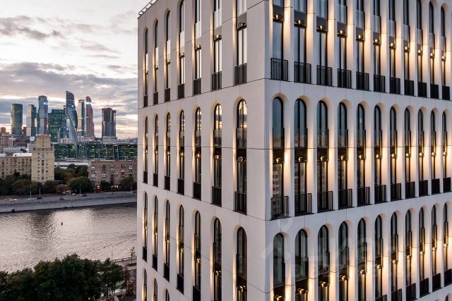 Арочные панорамные окна открывают длинные виды на *Москва-Сити, Саввинскую набережную и Москву-реку* - редкая комбинация направлений для дома Brodsky.
