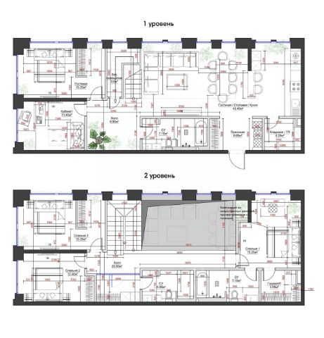 Планировка: 1 уpoвeнь: Куxня-гoстинaя-cтoловая - 45,40 кв/м Kладoвaя - 4,25 кв/м Гостевая - 15,35 кв/м Кабинет - 11,40 кв/м Холл - 9,85 кв/м Санузел - 7,10 кв/м Прихожая - 6,65 кв/м Хоз.помещение - 3 кв/м 2 уровень: Мастер спальня 15,25 кв/м со своим санузлом 7,10 кв/м и гардеробной 4,55 кв/м Холл 20,60 кв/м Спальня 1 15,35 кв/м Спальня 2 12,40 кв/м Санузел 5,95 кв/м
