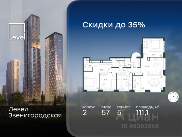 Цена указана с учётом скидки при 100%-й оплате, несубсидированной ипотеке, рассрочке (кроме программы "Рассрочка 0%"). В жилом квартале продаётся многокомнатная квартира площадью 110.20 кв.м без отделки. Квартира расположена на 55 этаже 64 этажного корпуса 2 в жилом комплексе комфорт класса Левел Звенигородская (компания Level Group/Левел групп). Отличная транспортная доступность - 5 мин. пешком до метро "Звенигородская" (откроется к окончанию строительства); - 18 мин. пешком до станции МЦК "Хорошёво" и станции БКЛ "Народное ополчение"; - 4 мин. на авто до ТТК; - 8 мин. на авто до Садового кольца; - 15 мин. на авто до Кремля. Продуманный архитектурный проект - Концепция от студии Станислава Михаловского, в основу которой легло единение природы и города; - Двухкамерные стеклопакеты в окнах, алюминиевый и ПВХ профиль - в квартирах тепло зимой и прохладно летом; - С верхних этажей откроются панорамные виды на город, Москву-реку, "Москва-Сити" и Москворецкий парк; - Лобби со всеми удобствами: окна в пол, высокие потолки до 4,7 м, лаунж-зоны, колясочные, гостевые санузлы и мойки для лап животных; - Централизованные водонагреватели гарантируют круглогодичную подачу горячей воды в каждую квартиру. Благоустройство Концепция благоустройства разработана совместно с бюро UNK landscape. Высота башен приближается к 200 метрам - они словно касаются неба. Небесный простор проецируется на территорию двора с помощью подсветки, визуально увеличивая пространство и отражаясь в авторских элементах архитектуры. На территории площадью 0,45 га расположатся: - "Облако событий" - место встреч и общения; - "Облако спорта" - всё для поддержания себя в форме; - "Облако принятия решений" - пространство для работы на свежем воздухе; - "Облако спокойствия" - для отдыха в тишине природы; - "Облако игр" - площадки для подростков и самых маленьких. Инфраструктура В жилом комплексе откроется 21 коммерческое помещение: продуктовые лавки, кафе, салоны красоты, службы доставки и творческие студии. Этап 1 включает строительство двухуровневого подземного паркинга. Всего здесь расположится 351 машино-место, включая семейные места, и 264 кладовых помещения. В распоряжении жителей развитая инфраструктура района: 15 супермаркетов, 5 спортивных объектов, 9 медучреждений, 7 детских садов, 4 школы, 3 благоустроенных парка - всё в шаговой доступности. Инженерия Комфортное перемещение внутри домов будут обеспечивать надёжные лифты с доступом в паркинг с жилых этажей. В каждом корпусе предусмотрено до шести кабин, включая сервисные лифты. Попасть на территорию комплекса можно только по единому ключу доступа. Видеонаблюдение установлено на входах в подъезды, в лобби, в общих зонах, на въезде в паркинг. Гости смогут связаться с жителями дома через входные видеопанели, а управлять доступом на территорию можно через видеодомофон или приложение на телефоне.