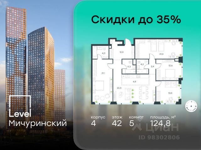 Цена указана с учётом скидки при 100%-й оплате, несубсидированной ипотеке, рассрочке (кроме программы "Рассрочка 0%"). В жилом квартале, расположенном на границе с природным заказником "Долина реки Очаковки", продаётся многокомнатная квартира площадью 121.40 кв.м с отделкой white box. Квартира расположена на 25 этаже 30-этажного корпуса 3 в жилом комплексе бизнес-класса Level Мичуринский (компания Level Group/Левел групп). Отличная транспортная доступность - 10 мин. пешком до станции метро "Мичуринский проспект" - 15 мин. пешком до станции метро "Аминьевская" - 7 мин. на авто до МКАД - 10 мин. на авто до ТТК - 15 мин. на авто до Москва-Сити Продуманный архитектурный проект - Выразительная архитектура от известных бюро: корпуса 1-6 - СПИЧ, корпуса 7-13 - Borisov Architects; - Из окон открываются живописные виды на парки, Москва-Сити и МГУ; - Высокие потолки до 6,35 м; - Стильные лобби с окнами в пол и высокими потолками до 4,7 м; - С каждого этажа дома на лифте можно спуститься в подземный отапливаемый паркинг. Расположение Level Мичуринский строится в одном из самых зеленых районов Москвы - Очаково-Матвеевское. Этот уголок столицы идеален для поддержания здорового образа жизни. В шаговой доступности от проекта находятся заказник "Долина реки Очаковки" - 1 мин. пешком и Очаковский парк - 7 мин. пешком. На велосипеде можно добраться до таких парков, как "Событие", парк Олимпийской деревни, парк 50-летия Октября и парк Школьников. В 15-минутной доступности на авто расположено более 30 детских садов (из них 14 в пешей доступности), 32 школы (из них 13 в пешей доступности) и 14 вузов. В ближайшем окружении работает более 25 медицинских учреждений, 11 спортивных клубов и 22 продуктовых супермаркета. Внутренняя инфраструктура На территории жилого комплекса строится три детских сада и школа. На первых этажах домов откроется супермаркет, фитнес-центр, ресторан, кафе и другие сервисы. Подземные этажи займут паркинги: трехуровневые в этапах 1 и 2, одноуровневый в этапах 3 и 4. Преимущества проекта - 4,5 га благоустроенной территории с видовым мостом, уличным кинотеатром, зонами для тихого отдыха, работы, воркаута, площадки для петанка, футбола, настольного тенниса и пляжного волейбола; - Дизайнерские лобби с панорамным видом на двор, мойками для лап животных и комфортными зонами ожидания. - Безопасность жителей: круглосуточное видеонаблюдение всех зон общего пользования (лобби, лифты, паркинги, детские площадки), система контроля доступа, управление видеодомофоном через мобильное приложение, единый ключ доступа на территорию жилого комплекса. - Технологии и комфорт: высокоскоростной Wi-Fi в лобби и на придомовой территории, автоматическая система контроля и учета ресурсов, абонентская связь с консьержем, распознавание номеров автомобилей при въезде/выезде в/из паркинга.