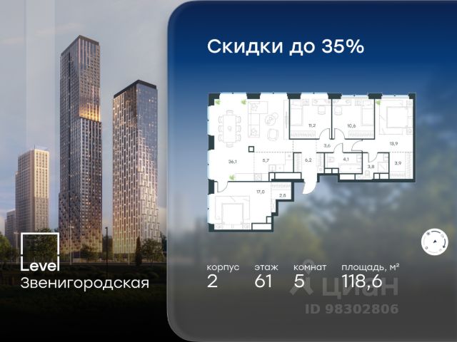Цена указана с учётом скидки при 100%-й оплате, несубсидированной ипотеке, рассрочке (кроме программы "Рассрочка 0%"). Ключи в момент покупки! В готовом жилом комплексе на набережной Москвы-реки продается многокомнатная квартира площадью 134 кв.м без отделки. Квартира расположена на 19 этаже 32 этажного корпуса " Север" в жилом комплексе бизнес-класса Level Причальный (компания Level Group/Левел групп). Возможность купить машино-место в подземном паркинге. Отличная транспортная доступность - 7 мин. пешком до станции метро и МЦК "Шелепиха"; - 5 мин. на авто до ТТК; - 10 мин. на авто до Москва-Сити; - 13 мин. на авто до Садового кольца. Продуманный архитектурный проект - концепция от архитектурного бюро "Остоженка"; - окна высотой до 3,03 м и шириной до 4,3 м; - виды на МГУ, Москва-Сити, высотки на Смоленской и Кудринской площадях; - квартиры с террасой для отдыха и работы на свежем воздухе; - квартиры сдаются без отделки - прекрасная возможность для создания уникального интерьера. Технологии и безопасность - система приточной вентиляции обеспечит свежий воздух в квартирах; - собственные центральные водонагреватели - гарантия горячей воды в каждой квартире круглый год; - единый ключ доступа по всей территории ЖК; - высокоскоростные лифты OTIS. Благоустройство Дизайн внутренней территории Level Причальный разработан совместно со студией UpLand. Это уникальный двухуровневый двор с пространством для жителей любого возраста. Концепция игрового пространства верхнего яруса - каникулы на морском побережье. Дети будут в восторге от большого скалодрома и песочницы-пляжа площадью 280 м². Здесь находится безопасная площадка для малышей с фигурой кита-полосатика по центру. Верхний и нижний уровни двора соединяет 90-метровый мост-пергола. Дети смогут спускаться с него по горкам, будто ныряя в пучину океана. На нижнем уровне всё располагает к размеренному отдыху: прогулкам, беседам, релаксу на шезлонгах, творческим вечерам в амфитеатре или командным активностям с соседями. Все общественные зоны жилого комплекса, включая двор и лобби, имеют доступ к сети Wi-Fi. Внутренняя инфраструктура В жилом комплексе предусмотрен собственный торговый центр с супермаркетом, фитнес-центром и другими сервисами. Просторные входные группы с потолками до 4,4 м подчёркивают статусность дома. Для удобства предусмотрены мойки для лап животных, кладовые, гостевые санузлы и теплый подземный паркинг на 694 машино-места. Инфраструктура района Level Причальный расположен в районе Хорошёво-Мнёвники, одном из самых экологически чистых и престижных районов СЗАО Москвы. В 15-минутной доступности на авто - 50 детских садов, 22 школы, 5 торговых центров, десятки супермаркетов и фитнес-клубов. И совсем скоро Шелепихинская набережная, на которой расположен жилой комплекс, приобретет новый облик и станет одним из главных мест притяжения резидентов Level Причальный.