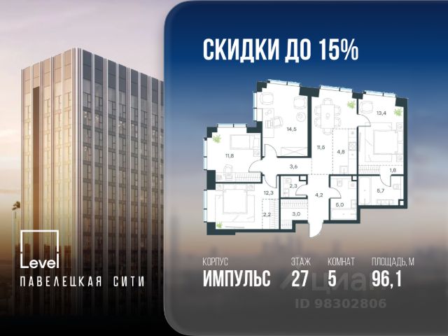 В Даниловском районе столицы (ЮАО) продаётся многокомнатная квартира площадью 111.40 кв.м без отделки. Квартира расположена на 16 этаже 20-этажного корпуса 'Горизонт' в жилом комплексе бизнес-класса Павелецкая Сити. Высота потолков 3.00м. Престижная локация "Павелецкая Сити" - жилой комплекс бизнес-класса, расположенный в престижном Даниловском районе Москвы, на границе с ЦАО. Проект находится в историческом центре города в окружении парков, Москвы-реки и сформированной инфраструктуры. В пределах 20 минут пешком есть 3 станции метро, а в 5 минутах езды на авто - ТТК и Садовое кольцо. - 15 мин. пешком до метро "Павелецкая"; - 20 мин. пешком до станций "Тульская" и "Серпуховская"; - 8 мин. на авто до Кремля; - 10 мин. на авто до парка Горького и парка "Зарядье"; - 20 мин. на авто до башен "Москва-Сити". Авторская архитектура Архитектурная концепция разработана бюро СПИЧ по индивидуальному проекту. Облик корпусов I и II очередей отсылает к стилистике архитектуры классического Нью-Йорка и золотой эпохи Голливуда. Корпуса IV очереди вдохновлён эстетикой ар-деко в её современном переосмыслении. Благодаря линейному расположению корпусов из большинства квартир будут открываться потрясающие виды на исторический центр города и Москву-реку. Дизайнерские лобби Изысканные интерьеры лобби жилого комплекса отсылают к классическим фильмам золотой эпохи Голливуда. Классика в "Павелецкая Сити" - не имитация, а современное осмысление лучшего в этом стиле. В каждом вестибюле оборудованы стойки ресепшен, комфортные зоны ожидания, гостевые санузлы, мойки для лап животных, колясочные. В корпусах по 3-4 лифта, включая сервисный, с прямым доступом в паркинг. Площадь лобби - от 47,9 до 114,9 кв. м, высота потолков - до 5,46 м. Благоустройство и инфраструктура Для создания благоустройства было приглашено 2 ведущих бюро - ADM и GAFA. Разноуровневое пространство вмещает всё необходимое для качественного досуга: игровые площадки для детей всех возрастов, тропы здоровья для пеших прогулок, крытые аллеи с качелями, места для работы на свежем воздухе, многофункциональные спортивные площадки - воркаут-зоны, столы для пинг-понга, зоны командных игр. Общая площадь закрытого двора - 4,63 га. Комфорт - это когда рядом всё, что нужно для жизни. На первых этажах и в стилобатной части корпусов "Павелецкая Сити" размещены 85 коммерческих помещений, где откроются супермаркеты, кафе, пекарни, аптеки и другие службы сервиса. В составе проекта также предусмотрены собственный фитнес-клуб и развивающий центр Letovo Kids, а также школа на 720 мест и детский сад на 175 мест. Технологии и безопасность - Wi-Fi в лобби и на придомовой территории; - Автоматизированная система контроля и учета ресурсов; - Круглосуточное видеонаблюдение и охрана; - Круглосуточная связь с охраной через приложение, телефон или кол-центр; - Контроль доступа по биометрической системе Face-ID; - Усиленный сотовый сигнал в лифтах и паркинге; - Распознавание номеров автомобилей при въезде/выезде в/из паркинга.