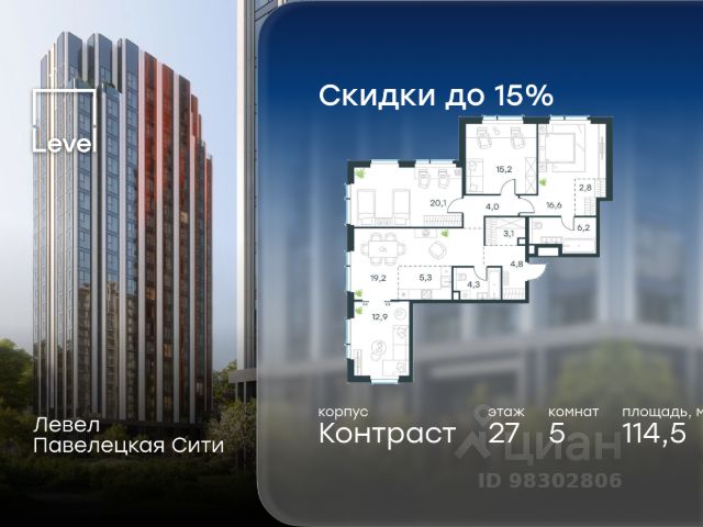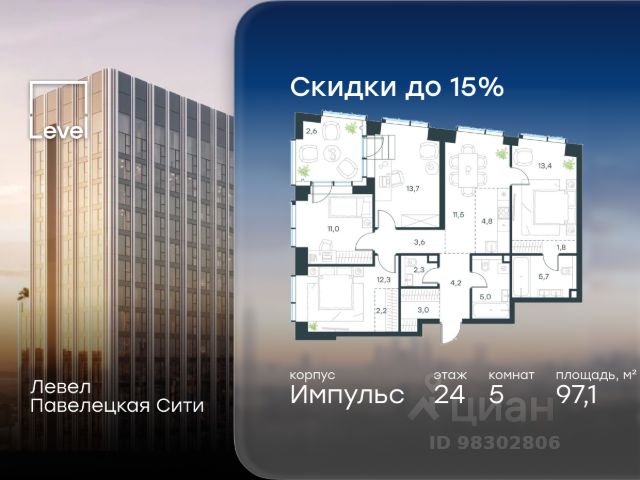 Цена указана с учётом скидки при 100%-й оплате, несубсидированной ипотеке, рассрочке (кроме программы "Рассрочка 0%"). В Даниловском районе столицы (ЮАО) продаётся многокомнатная квартира площадью 97.10 кв.м без отделки. Квартира расположена на 24 этаже 45-этажного корпуса 'Горизонт' в жилом комплексе бизнес-класса Левел Павелецкая Сити. Высота потолков 3.00м. Престижная локация Левел Павелецкая Сити - это жилой комплекс бизнес-класса, расположенный в престижном Даниловском районе Москвы - историческом центре города в окружении парков, Москвы-реки и новейшей инфраструктуры. В 20 минутах пешком есть 3 станции метро, а в 5 минутах езды на авто - ТТК и Садовое кольцо. - 15 мин. пешком до метро "Павелецкая"; - 20 мин. пешком до станций "Тульская" и "Серпуховская"; - 8 мин. на авто до Кремля; - 10 мин. на авто до парка Горького и парка "Зарядье"; - 20 мин. на авто до башен "Москва-Сити". Авторская архитектура Авторская архитектурная концепция разработана бюро СПИЧ. Облик корпусов I и II очередей отсылает к стилистике архитектуры классического Нью-Йорка и золотой эпохи Голливуда. Корпуса IV очереди вдохновлены эстетикой ар-деко. Умное линейное расположение корпусов гарантирует потрясающие виды на исторический центр и Москву-реку из большинства квартир. Дизайнерские лобби Изысканные интерьеры лобби жилого комплекса отсылают к классическим фильмам золотой эпохи Голливуда. Классика в жилом комплексе Левел Павелецкая Сити - не имитация, а современное осмысление лучшего в этом стиле. В каждом вестибюле оборудованы стойки ресепшен, комфортные зоны ожидания, гостевые санузлы, мойки для лап животных, колясочные. В корпусах по 3-4 лифта с прямым доступом в паркинг. Площадь лобби - от 47,9 до 114,9 кв. м, высота потолков - до 5,46 м. Благоустройство и инфраструктура Для создания благоустройства было приглашено 2 ведущих бюро - ADM и GAFA. Разноуровневое пространство вмещает в себя игровые площадки для детей всех возрастов, тропы здоровья для пеших прогулок, крытые аллеи с качелями, места для работы на свежем воздухе, многофункциональные спортивные площадки - воркаут-зоны, столы для пинг-понга, зоны командных игр. Общая площадь закрытого двора - 4,63 га. Комфорт - это когда рядом всё, что нужно для жизни. В жилом комплексе Левел Павелецкая Сити размещены 85 коммерческих помещений, где откроются супермаркеты, кафе, аптеки и многое другое. В составе проекта также предусмотрены собственный фитнес-клуб, развивающий центр Letovo Kids, школа на 720 мест и детский сад на 175 мест. Технологии и безопасность - Wi-Fi в лобби и на придомовой территории; - Автоматизированная система контроля и учета ресурсов; - Круглосуточное видеонаблюдение и охрана; - Круглосуточная связь с охраной через приложение, телефон или кол-центр; - Контроль доступа по биометрической системе Face-ID; - Усиленный сотовый сигнал в лифтах и паркинге; - Распознавание номеров автомобилей при въезде/выезде в/из паркинга.