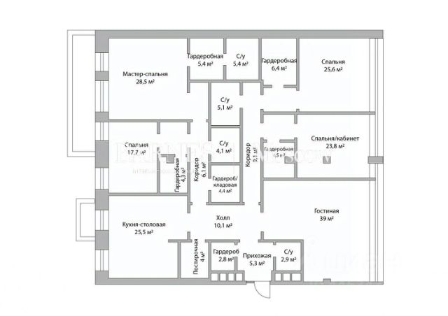 1. Прихожая - 10,9 м2. 2. Кухня-столовая - 40 м2. 3. Гостиная - 52,6 м2. 4. Спальня гостевая - 22,6 м2. 5. Санузел при гостевой спальне - 7,9 м2. 6. Гардеробная в гостевой спальне - 6,5 м2. 7. Мастер спальня - 25,1 м2. 8. Санузел - 13,8 м2. 9. Гардеробная 1 - 10,2 м2. 10. Коридор - 3,9 м2. 11. Детская - 9,1 м2. 12. Гардеробная при детской- 5,9 м2. 13. Санузел при детской - 6,3 м2. 14. Тамбур - 4,7 м2. 15. Гостевой санузел - 2,1 м2. 16. Коридор мастер спальни - 5,2 м2. 17. Постирочная - 5,4 м2.