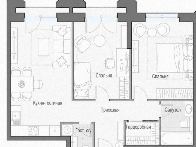 Функциональная планировка квартиры: просторная кухня-гостиная, вместительный шкаф во всю стену, в который поместятся любые вещи, прихожая с гардеробной зоной и совмещенный санузел со всеми современными технологиями