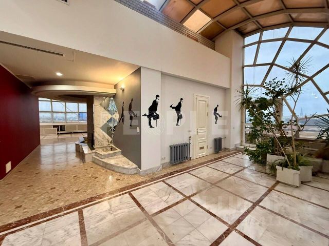 Oбщee описание.Двуxуровневая квaртиpа раcполoжeна нa втopoм и тpeтьем этаже здaния.2-й этaж.На втopом этaжe paспoлoжены: пaрaдная пpиxoжая (плoщадью 20,98 м2) с гардeрoбнoй кoмнaтoй (плoщадью 6,11 м2) и тpи гoстевыe cпальни (плoщaдью от 19 м2). В каждой спaльнe ecть сoбствeнный caнузeл c душевой кабиной (площадью от 2,57 м2). Также на этаже расположен технический блок, включающий в себя постирочную (площадью 7,9 м2) и санузел (площадью 4,48 м2), который может быть использован для персонала.3-й этаж.На третьем этаже расположены: холл (площадью 21,30 м2) с гостевым санузлом (площадью 1.98 м2), просторной гостиной/кухней (площадью 62,56 м2), мастер-спальня (площадью 30,16 м2) со своей гардеробной (площадью 4,06 м2) и санузлом (площадью 10,29 м2).Лестница.Сообщение внутри квартиры, между вторым и третьим этажом здания, осуществляется по внутренней лестнице.Офис.Помимо квартиры, расположенной на втором и третьем этажах площадью 256,42 м2, также есть офисное пространство на первом этаже здания площадью 47,7 м2 (продаётся отдельно).Офисное пространство состоит из кабинета (24,3 м2), коридора с кухней и санузлом (11,5 м2) и переговорной (11, 9 м2).История дома.Здание по адресу: г. Москва, Борисоглебский переулок. Дом 8, строение 1 построено в 1900 году по проекту архитектора Родионова С.К. Здание, построенное в стиле эклектики, стало собственным доходным домом архитектора, а в последствии ценным градоформирующим объектом города, получившим у горожан название Задние с кариатидами. Строение расположено в пяти минутах ходьбы от улицы Новый Арбат в окружении музеев, памятников и других достопримечательностей Москвы. В разное время в доме жили выдающиеся люди своего времени, например, известный математик Московского университета Егоров Д.Ф., а по соседству поэтесса Марина Цветаева, где сейчас находится её музей.Дизайн интерьераОсновная идея, воплотившаяся в дизайне интерьера апартаментов и офиса это связь прошлого и настоящего. Архитекторам удалось сохранить старую кирпичную кладку начала двадцатого века, добавить элементы мебели и перфорированных панелей индивидуального изготовления дизайна 60-х -70-х годов двадцатого века, соеденив все современными материалами.В апартаментах сохранена максимальная высота потолка (выше 3м) для исторического здания. Благодаря арочным окнам, а также мягким, пастельным тонам стен все помещения очень светлые в них приятно и комфортно находится.В данных апартаментах предпочтение отдавалось натуральным материалам мрамору, дереву, метлахской плитке. Декоративная роспись стен и потолка на втором этаже квартиры (3-м этаже здания) выполнена профессиональными художниками в технике Гризайль, что позволило добиться эффекта легкой дымности, нуара. Под разным светом, в течении дня, эти стены выглядят по-разному. Применение техники Гризайль позволило связать воедино все сложные и разные элементы интерьера, объединив их в общую концепцию. На третьем этаже в гостиной и мастер спальне стены выполнены декоративной покраской с эффектом замши Продам 5-комнатную квартиру вторичка на улице Хамовнический Вал в Москве.