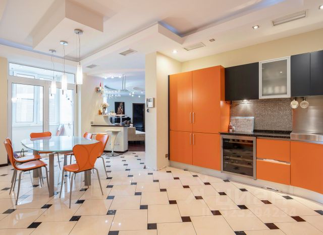 Кухонный гарнитур Verona (Италия) по индивид. проекту со столешницей из натурального камня с ирризацией. Варочная панель и духовой шкаф Miele, вытяжной модуль Kuppersbusch, п/моечная машина Bosch, винный температурный шкаф LIEBHERR Vinidor, два встроенных холодильника LIEBHERR. Диван в гостиной выполнен по индивид. заказу в стиле основной мебели. Портал между кухней и гостиной расписан под мрамор вручную. Во всех помещениях многоуровневое освещение. Люстры: Муранское стекло, керамика Италия. Встроенные светильники со стразами Swarovski.