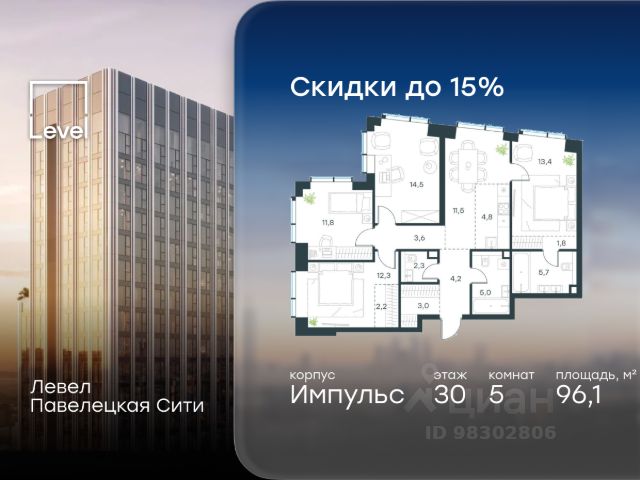 Цена указана с учётом скидки при 100%-й оплате, несубсидированной ипотеке, рассрочке (кроме программы "Рассрочка 0%"). В Даниловском районе столицы (ЮАО) продаётся многокомнатная квартира площадью 96.10 кв.м без отделки. Квартира расположена на 30 этаже 45-этажного корпуса 15 в жилом комплексе бизнес-класса Левел Павелецкая Сити. Высота потолков 3.00м. Престижная локация Жилой комплекс бизнес-класса Левел Павелецкая Сити расположен в престижном Даниловском районе Москвы - историческом центре города в окружении парков, Москвы-реки и новейшей инфраструктуры. В 20 минутах пешком есть 3 станции метро, а в 5 минутах езды на авто - ТТК и Садовое кольцо. - 15 мин. пешком до метро "Павелецкая"; - 20 мин. пешком до станций "Тульская" и "Серпуховская"; - 8 мин. на авто до Кремля; - 10 мин. на авто до парка Горького и парка "Зарядье"; - 20 мин. на авто до башен "Москва-Сити". Авторская архитектура Авторская архитектура Авторская архитектурная концепция разработана бюро СПИЧ. Облик корпусов этапов 1 и 2 отсылает к стилистике архитектуры классического Нью-Йорка и золотой эпохи Голливуда. Корпуса этапа 4 вдохновлены эстетикой ар-деко. Умное линейное расположение корпусов гарантирует потрясающие виды на исторический центр и Москву-реку из большинства квартир. Дизайнерские лобби Изысканные интерьеры лобби жилого комплекса отсылают к классическим фильмам золотой эпохи Голливуда. Классика в жилом комплексе Левел Павелецкая Сити - не имитация, а современное осмысление лучшего в этом стиле. В каждом вестибюле оборудованы стойки ресепшен, комфортные зоны ожидания, гостевые санузлы, мойки для лап животных, колясочные. В корпусах по 3-4 лифта с прямым доступом в паркинг. Площадь лобби - от 47,9 до 114,9 кв. м, высота потолков - до 5,46 м. Благоустройство и инфраструктура Для создания благоустройства было приглашено 2 ведущих бюро - ADM и GAFA. Разноуровневое пространство вмещает в себя игровые площадки для детей всех возрастов, тропы здоровья для пеших прогулок, крытые аллеи с качелями, места для работы на свежем воздухе, многофункциональные спортивные площадки - зоны уличных тренировок, столы для пинг-понга, зоны командных игр. Общая площадь закрытого двора - 4,63 га. Комфорт - это когда рядом всё, что нужно для жизни. В жилом комплексе Левел Павелецкая Сити размещены 85 коммерческих помещений, где откроются супермаркеты, кафе, аптеки и многое другое. В составе проекта также предусмотрены собственный фитнес-клуб, развивающий центр Летово Кидс. Технологии и безопасность - Вайфай в лобби и на придомовой территории; - Автоматизированная система контроля и учета ресурсов; - Круглосуточное видеонаблюдение и охрана; - Круглосуточная связь с охраной через приложение, телефон или кол-центр; - Контроль доступа по биометрической системе распознавания лица; - Усиленный сотовый сигнал в лифтах и паркинге; - Распознавание номеров автомобилей при въезде/выезде в/из паркинга.
