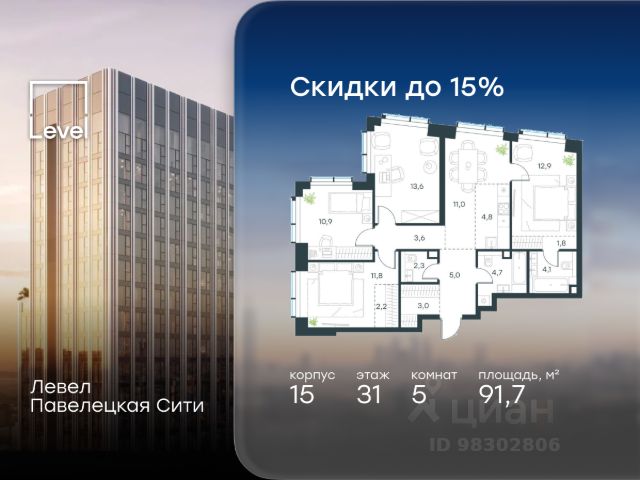Цена указана с учётом скидки при 100%-й оплате, несубсидированной ипотеке, рассрочке (кроме программы "Рассрочка 0%"). В Даниловском районе столицы (ЮАО) продаётся многокомнатная квартира площадью 96.10 кв.м c предчистовой отделкой. Квартира расположена на 27 этаже 45-этажного корпуса 15 в жилом комплексе бизнес-класса Левел Павелецкая Сити. Высота потолков 3.00м. Престижная локация Жилой комплекс бизнес-класса Левел Павелецкая Сити расположен в престижном Даниловском районе Москвы - историческом центре города в окружении парков, Москвы-реки и новейшей инфраструктуры. В 20 минутах пешком есть 3 станции метро, а в 5 минутах езды на авто - ТТК и Садовое кольцо. - 15 мин. пешком до метро "Павелецкая"; - 20 мин. пешком до станций "Тульская" и "Серпуховская"; - 8 мин. на авто до Кремля; - 10 мин. на авто до парка Горького и парка "Зарядье"; - 20 мин. на авто до башен "Москва-Сити". Авторская архитектура Авторская архитектура Авторская архитектурная концепция разработана бюро СПИЧ. Облик корпусов этапов 1 и 2 отсылает к стилистике архитектуры классического Нью-Йорка и золотой эпохи Голливуда. Корпуса этапа 4 вдохновлены эстетикой ар-деко. Умное линейное расположение корпусов гарантирует потрясающие виды на исторический центр и Москву-реку из большинства квартир. Дизайнерские лобби Изысканные интерьеры лобби жилого комплекса отсылают к классическим фильмам золотой эпохи Голливуда. Классика в жилом комплексе Левел Павелецкая Сити - не имитация, а современное осмысление лучшего в этом стиле. В каждом вестибюле оборудованы стойки ресепшен, комфортные зоны ожидания, гостевые санузлы, мойки для лап животных, колясочные. В корпусах по 3-4 лифта с прямым доступом в паркинг. Площадь лобби - от 47,9 до 114,9 кв. м, высота потолков - до 5,46 м. Благоустройство и инфраструктура Для создания благоустройства было приглашено 2 ведущих бюро - ADM и GAFA. Разноуровневое пространство вмещает в себя игровые площадки для детей всех возрастов, тропы здоровья для пеших прогулок, крытые аллеи с качелями, места для работы на свежем воздухе, многофункциональные спортивные площадки - зоны уличных тренировок, столы для пинг-понга, зоны командных игр. Общая площадь закрытого двора - 4,63 га. Комфорт - это когда рядом всё, что нужно для жизни. В жилом комплексе Левел Павелецкая Сити размещены 85 коммерческих помещений, где откроются супермаркеты, кафе, аптеки и многое другое. В составе проекта также предусмотрены собственный фитнес-клуб, развивающий центр Летово Кидс. Технологии и безопасность - Вайфай в лобби и на придомовой территории; - Автоматизированная система контроля и учета ресурсов; - Круглосуточное видеонаблюдение и охрана; - Круглосуточная связь с охраной через приложение, телефон или кол-центр; - Контроль доступа по биометрической системе распознавания лица; - Усиленный сотовый сигнал в лифтах и паркинге; - Распознавание номеров автомобилей при въезде/выезде в/из паркинга.