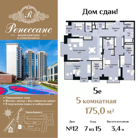 Жилой комплекс премиум-класса "Ренессанс" расположен на Рубцовско-Дворцовой улице старинного района Сокольники, в нескольких минутах ходьбы от знаменитого парка "Сокольники" - самого большого парка Москвы и одного из крупнейших в Европе, где круглый год можно прекрасно проводить время всей семьей. Из панорамных окон премиального бренда Schuco открываются завораживающие виды на сияющие в лучах солнца купола церквей и храмов, изумрудную зелень легендарного парка "Сокольники" и национального парка "Лосиный остров", излучины реки Яузы с величественной гранитной набережной, старинные здания, среди которых дворец императрицы Елизаветы Петровны, небоскребы "Москва-Сити", Останкинскую телебашню и приватную, охраняемую территорию комплекса с концепцией "двор без машин", изысканным ландшафтным дизайном, богатой коллекцией растений, пространствами для отдыха с роскошным фонтаном с красивой подсветкой, элегантной перголой, большими шахматами, детскими городками и спортивными площадками. Роскошный интерьер лобби: натуральный испанский мрамор, вертикальный фонтан, репродукции картин эпохи Возрождения, великолепная итальянская люстра ручной работы с подвесками из хрусталя CutCrystal и муранского стекла, иранские ковры и дизайнерская мебель. Лифты премиум-класса ThyssenKrupp. Консьерж-сервис. На этажах мусорокамеры закрытого типа. Из квартиры можно связаться с консьержем по видеодомофону британской компании BAS-IP. Уникальная транспортная доступность: 5 мин. на авто - до ТТК и Русаковской эстакады; 10 мин. - до Садового кольца и улицы Земляной Вал; 15 мин. - до Кремлевской набережной. В шаговой доступности - ст. м. и БКЛ "Сокольники" и "Электрозаводская". Развитая собственная инфраструктура: подземный паркинг, здание фитнес-центра с бассейнами, объекты торговли и сферы услуг. Отличная инфраструктура респектабельного района Сокольники: детские сады, элитные общеобразовательные, музыкальные и спортивные школы, ТЦ, рестораны, банки.