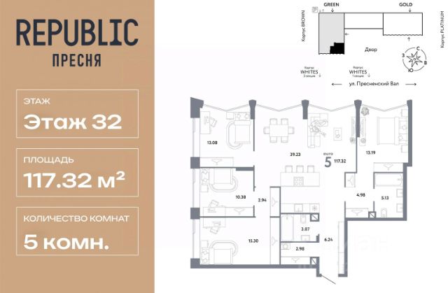 Новая квартира в ЖК "Republic" напрямую от федерального застройщика "Страна Девелопмент". Продается 5комнатная квартира на 31 этаже от застройщика Страна Девелопмент. Площадь квартиры 117,32 кв. м. Стоимость указана без учета акций. Дизайн-квартал "Republic" — новый проект премиум-класса в Москве. 10 жилых башен и 4 восстановленных здания локомотивного депо образуют уникальное пространство. "Republic" — место, где вы ощутите гармонию истории и современности. Детский сад, SPA-комплекс с бассейном, гастрономический и шопинг-центры, собственный бульвар и яркие арт-пространства — для жителей предусмотрены все элементы премиального комфорта. Преимущества Уникальная жизненная среда, где инфраструктура включает гастрономию, SPA-комплекс с термами, образовательные и развлекательные заведения, арт-пространство и шопинг-аллеи. Двор от британского бюро "Gillespies": на 4 гектарах закрытого двора расположится 7 игровых зон для разных возрастов с ручьем и сухим фонтаном, арт-галерея под открытым небом и большой прогулочный бульвар. Лобби с террасой в башнях "Reds" — лаконичное пространство галереи-лобби, где можно проводить деловые и дружеские встречи, не нарушая приватности квартиры. В тёплое время года не остаётся пустующей терраса на крыше, которая привлекает непринуждённой атмосферой и прохладительными напитками в баре. Клубная гостиная — стильное пространство оборудовано кухней и залом для торжеств на 40 человек, а для того, чтобы побыть наедине с собой, почитать книгу или провести онлайн-встречу в гостиной оборудована мастерская с библиотекой. Уникальные форматы квартир, где можно реализовать любой жизненный сценарий: от стильного офиса в двухэтажной квартире до угловых лотов с просторными гостиными. А эксклюзивные пентхаусы с высокими потолками и панорамными окнами дарят захватывающие виды на Москву.. Отделка Квартиры сдаются без отделки или в формате White box. При отделке White box уже были выполнены все шумные и грязные работы руками наших специалистов: произведена разводка электричества с установкой подрозетников, установлены откосы из гипсокартона, устроена стяжка пола с шумоизоляцией. Способы покупки Сотрудники "Страна Девелопмент" будут сопровождать вас на каждом этапе сделки, помогут получить одобрение по ипотеке или снизить ежемесячный платеж. - ипотека - рассрочка - с использованием материнского капитала - 100% оплата наличными