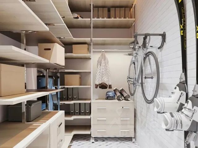 Кладовое помещение с системой хранения. Полностью изолированное. Стены из кирпича до потолка.