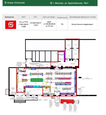 Встроено-пристроенное помещение на 1 этаже 17-ти этажного жилого дома с сетевым супермаркетом Магнит у выхода из метро. Магнит открыт. Показывает рекордные РТО с первых дней. Алко лицензия получена. 90 м от метро Алма-Атинская Первый этаж. Первая линия. Полностью свободная планировка Напротив пешеходный переход Рядом остановка общественного транспорта Движение трафика от метро вдоль витрин Устоявшийся плотный жилой массив. 7100 квартир в радиусе 500 м Дефицит коммеческих помещений в районе В супермаркете единственная пекарня и кофейня на районе. МАП: 4% от РТО но не менее 1 150 000 ₽ +НДС Безусловная индексация 3%