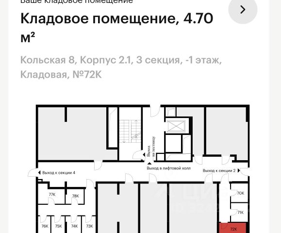 Продается кладовая 4,7 м2, на -1 этаже, секция 3 (подъезд 3), корпус 2.1. Ключи на руках. Прямая продажа.