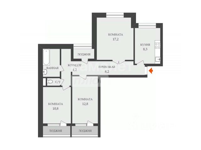 — комнаты изолированные: 17,2 м² (два окна), 12 м² и 11,9 м²