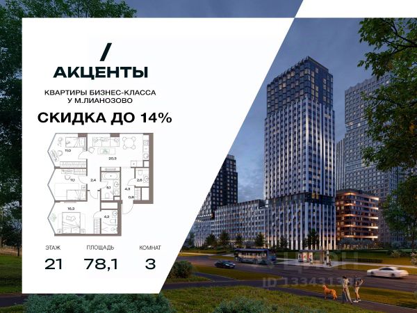 Четырехкомнатная квартира для любителей роскоши. -Личное пространство для каждого члена семьи -В квартире предусмотрено классическое остекление -Угловой вариант планировки с видом на 2 стороны -Приватная мастер-спальня с дополнительным окном, зоной гардеробной и личной ванной -Большая кухня-гостиная в центре квартиры для семейных торжеств и большой компании -Второй санузел для удобства каждого члена семьи -Дополнительная комната для организации детской или рабочего кабинета -Ниша для системы хранения в коридоре Молодой район для жизни "Акценты" в классе бизнес-лайт — точка роста на севере Москвы. Он предлагает элегантные и строгие фасадные решения, авторский ландшафтный дизайн, а также функциональные и доступные по цене планировки. Проект находится в семи минутах пешком от станции метро "Лианозово" и одноименной МЦД-1. Добраться до МКАД можно будет за 10 минут на авто, а дорога до центра займет около 20 минут. Жилой комплекс, расположенный в районе Восточного Дегунино, предлагает развитую инфраструктуру для тех, кто ценит выбор. Он имеет удобный доступ не только к транспорту, но и к паркам, школам, садам, больницам и другим социальным объектам. В пешей доступности находятся 4 поликлиники, 5 школ, 6 детских садов, 3 бассейна и баскетбольная академия. Еще рядом есть несколько лесопарков: "Лианозово" с аттракционами и спортивными площадками для тенниса, волейбола и баскетбола, "Останкино" с конным клубом, прудом и пейнтбол-площадками. А "Северные Дубки" — это завораживающее пространство для прогулок под кронами вековых дубов, берез и лип. Кроме того, в районе не будет скучно и юным жителям. Можно оттачивать трюки в скейтпарке "Союз". Ловким и прыгучим советуем записаться в акробатический центр "Белка".