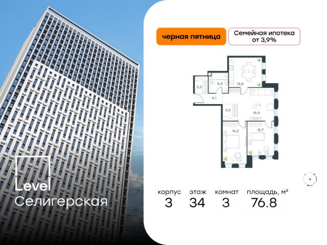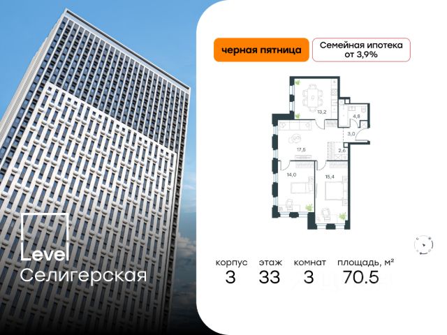 В жилом квартале, расположенном в южной части района Западное Дегунино, продаётся 3-комнатная квартира площадью 70.50 кв.м без отделки. Квартира расположена на 33 этаже 40-этажного корпуса Корпус 3 в жилом комплексе комфорт-класса Level Селигерская (компания Level Group/Левел групп).