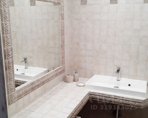 Отделка стен и пола плитка. Потолок натяжной. На одной из стен расположено красивое зеркало. Стиральная машина в рабочем состоянии остаётся в квартире.
