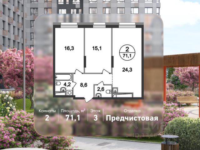 Продается двухкомнатная квартира с отделкой в 11 квартале города-парка "Первый Московский". Общая площадь квартиры - 76,5 кв. м, этаж 3 из 22. Планируемый срок ввода в эксплуатацию - 1 квартал 2029 года. Тип дома - монолитный. ТОЛЬКО ДО 30 АПРЕЛЯ выгодные условия на приобретение квартиры в ипотеку или рассрочку. Звоните - и мы подберем оптимальное предложение под ваш запрос! 5 корпус состоит из 2 секций: - 1 секция - без отделки - 2 секция - с отделкой White Box Город-парк "Первый Московский" расположен всего в 7 км по Киевскому шоссе от МКАД на территории Новой Москвы. Из города-парка прямой выезд на Киевское шоссе и трассу Солнцево-Бутово-Варшавское шоссе. ТРАНСПОРТНАЯ ДОСТУПНОСТЬ: - 7 мин. на личном автомобиле или 10 мин. на автобусе до станции метро "Филатов Луг" - 10 мин. на автомобиле или 20 мин. на автобусе до станции метро "Рассказовка" или "Саларьево" ПРЕИМУЩЕСТВА 5 КОРПУСА: - живописные виды на Ульяновский лесопарк - входные группы с безбарьерным входом - просторная колясочная в каждой секции - в каждой секции - 3 лифта: 2 пассажирских, 1 грузовой - количество квартир на этаже: 1 секция - 4 квартиры, 2 секция - 5 квартир - на 1-ом этаже в секции 2 расположено коммерческое помещение - на -1-ом этаже каждой секции запроектированы кладовые помещения - обеспеченность машино-местами: гостевой паркинг 48 м/м, многоуровневые паркинги рядом с домом ВНУТРЕННЯЯ ИНФРАСТРУКТУРА И БЛАГОУСТРОЙСТВО: Дома 11 квартала граничат с Ульяновским лесопарком. Вся территория 11 квартала разделена на 2 типа: - приватное дворовое пространство с детскими игровыми и спортивными площадками. Дворы свободны от машин. - прогулочные маршруты с зонами отдыха. Прогулочный маршрут объединяет дома 11 квартала в единое пространство, за счёт оригинальной геопластики создаётся уникальный разноуровневый ландшафтный узор. РАЗВИТАЯ ИНФРАСТРУКТУРА В ОКРУЖЕНИИ: - общеобразовательная школа 2120 корпус ш3 (всего в проекте 5 школ) - детский сад 2120 корпус д4 (всего в проекте 8 детских садов) - школа искусств - поликлиника - торговый центр Столица - кафе, продуктовые магазины, аптеки, фитнес центры, салоны красоты и пр. - в пешей доступности благоустроенный парк Филатов Луг
