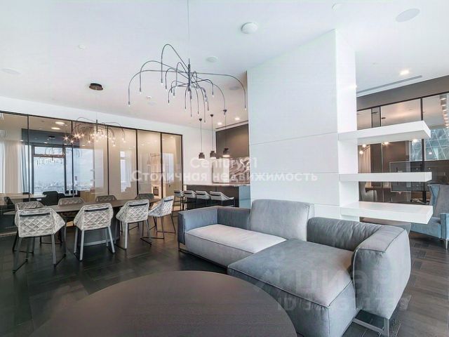 ID: 224232 Квартира, где роскошь становится естественной средой — 222 м² в МФК "Город Столиц", Москва-Сити, Пресненская набережная, д.8, стр.1. Интерьер — это гармония дизайнерской мысли и безупречного вкуса: мраморные поверхности, редкие породы дерева, авторские световые решения и панорамные окна, открывающие захватывающие виды на столицу. Пространство наполнено светом и воздухом, а каждая деталь отделки продумана до совершенства. Гостиная площадью 109 м² — настоящий центр притяжения, где масштаб и эстетика создают атмосферу для больших приёмов и тихих вечеров. Пространство зонировано с особым вниманием к комфорту: барная стойка для утренних завтраков плавно переходит в обеденную зону со столом на восемь персон, а диванная группа у камина формирует уютное место для отдыха и общения. Дополняют композицию два изящных диванчика у панорамных окон — идеальное место, чтобы любоваться городскими огнями и ощущать дыхание мегаполиса. Мастер-спальня — приватный сьют с ванной комнатой и гардеробной, оформленный в спокойных, глубоких тонах. Кабинет легко трансформируется во вторую спальню, сохраняя концепцию приватности и комфорта. Обе спальни — полноценные сьюты, каждая с собственной ванной и гардеробной, что делает планировку идеально сбалансированной. Высокий уровень отделки подчеркивает статус и уникальность пространства: от текстурных стеновых панелей до изысканных декоративных акцентов. Это место, где Москва-Сити перестаёт быть видом из окна и становится частью вашей истории