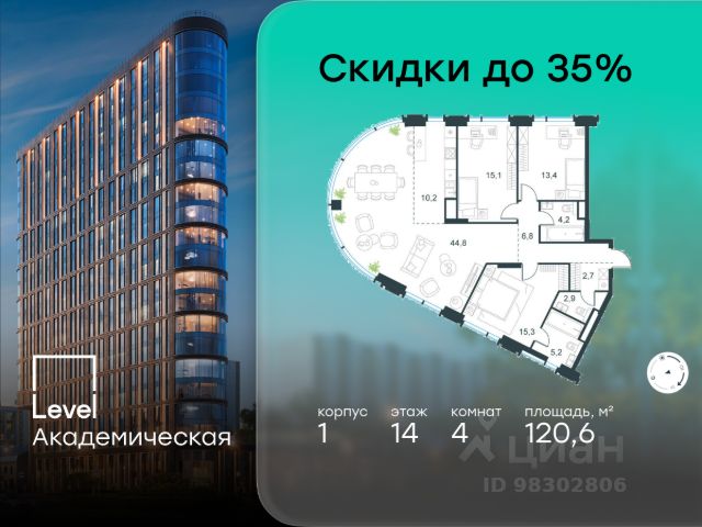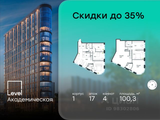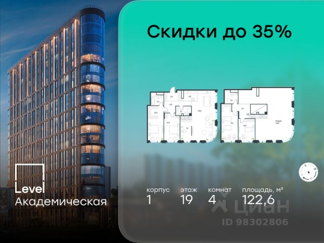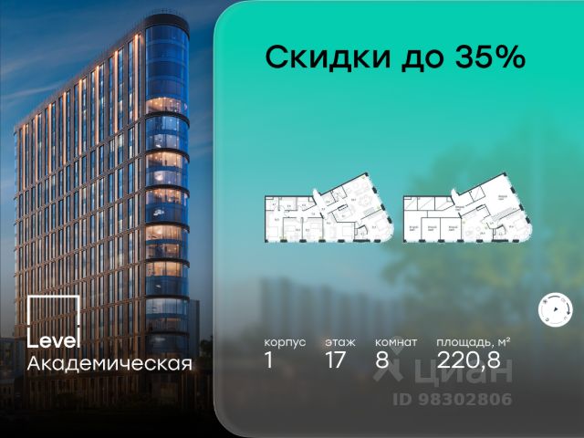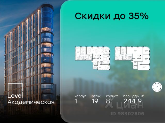 Цена указана с учётом скидки при 100%-й оплате, несубсидированной ипотеке, рассрочке (кроме программы "Рассрочка 0%"). В Академическом районе продаётся многокомнатная квартира площадью 244.90 кв.м без отделки. Квартира расположена на 19-м этаже 19-этажного жилого комплекса бизнес-класса Level Академическая (компания Level Group). Отличная транспортная доступность: - 1 мин. пешком до станции метро "Академическая"; - 4 мин. на автомобиле до ТТК; - 8 мин. на автомобиле до Садового кольца; - 13 мин. на автомобиле до Кремля. Продуманный архитектурный проект: - современная архитектура от бюро UNK project; - высокие потолки в квартирах до 6,62 м; - окна в пол высотой 2,5-2,68 м с панорамным видом на МГУ, Москва-Сити и другие доминанты Москвы; - квартиры с моллированным остеклением - радиусные окна открывают увеличенный угол обзора; - более 20 вариантов планировочных решений; - уникальные квартиры с собственным патио и возможностью обустройства дровяного камина; - квартиры сдаются без отделки, что открывает свободу для создания интерьера по своему вкусу. Расположение: Камерный проект из 1 корпуса расположен тихом зеленом районе Москвы, в непосредственной близости к центру города. В округе построено 80 детских садов, 50 школ и 30 вузов, 7 из которых входят в топ100 вузов России: МГУ, МГИМО, РАНХиГС, МИСИС, РУДН, РЭУ им. Плеханова и РГУ нефти и газа им. Губкина. Этот район буквально утопает в зелени парков, начиная с уютного Академического в 6 минутах пешком и заканчивая одним из крупнейших в городе парком 50-летия Октября (12 минут на автомобиле). Общая площадь природных объектов в радиусе 2-6 км от дома - 476,5 га. Внутренняя инфраструктура: На территории Level Академическая откроется собственный торговый центр, а для отдыха жителей будут созданы общественные пространства: комфортное лобби с дизайнерской отделкой, окнами в пол и потолками высотой 4,5 м, а также две благоустроенные зоны - территория по периметру здания и пространство на стилобате. Во дворе на стилобате предусмотрены детская и спортивная площадки, коворкинг и лаунж-зона на открытом воздухе. Стилобат украсят скульптуры животных - жирафа, зайца и волка, которые станут ярким акцентом внутреннего двора Level Академическая, подчеркивая близость к музею Дарвина. Процент озеленения территории - 58%. Технологии и безопасность: Жителей Level Академическая не коснется ежегодное отключение горячей воды благодаря собственным центральным водонагревателям. Безопасность гарантирует круглосуточная охрана, безлимитный Wi-Fi, круглосуточное видеонаблюдение. Удобное перемещение внутри комплекса будут обеспечивать 5 лифтов с доступом в паркинг с жилых этажей.