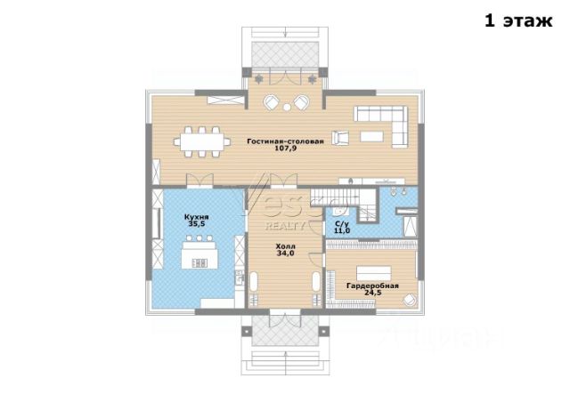 объединенное пространство кухни (21,3), гостиной (21) и столовой (14,3),