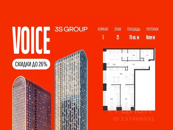 Ипотека от 3,5% на весь срок. Дополнительная скидка в офисе продаж! Продается уютная 3-комн. квартира площадью 70 кв.м на 25 этаже жилого комплекса бизнес-класса Voice Towers от 3S Group. Общая площадь: 70 кв.м., жилая: 50,6 кв.м., площадь кухни-гостиной: 18,5 кв.м., высокие потолки: 3,12 м., санузел совмещенный. О проекте: Voice. Высокие стандарты жизни Мы уверены, что высокие идеалы неизменно помогают достигать высот. Создавая Voice, мы ориентировались на людей с высокими требованиями к качеству и безупречным вкусом. Башни жилого комплекса, сочетают элегантную форму с динамичной геометрией фасадов, устремляются ввысь и отвечают самым высоким стандартам строительства. Технологичность, воплощенная в архитектуре - это ваш, собственный Voice. Преимущества локации Близость к метро Текстильщики, БКЛ и МЦК Новохохловская (10 мин) Рядом природный заповедник и конно-спортивная база Кузьминки-Люблино Будущее окружение Проект Южный порт - Текстильщики с деловым центром Сити-2 Небоскребы высотой до 300м Культурный центр с амфитеатром Променад вдоль Москвы-реки и яхт-клуб Архитектура Проект от Архитектурной мастерской Алексея Ильина Две перпендикулярные башни с арочными вершинами Высокая башня: светло-серый металл Низкая башня: терракотовая керамика Благоустройство Внешняя зона: парковки, магазины, кафе Внутренний двор: закрытая территория с озеленением Шумозащитный экран Сезонное озеленение Встречи на высоте Гранд-лобби высотой 8м Дизайнерская мебель Умные скоростные лифты Услуги Детский центр с игровой зоной Фитнес-студия для жителей