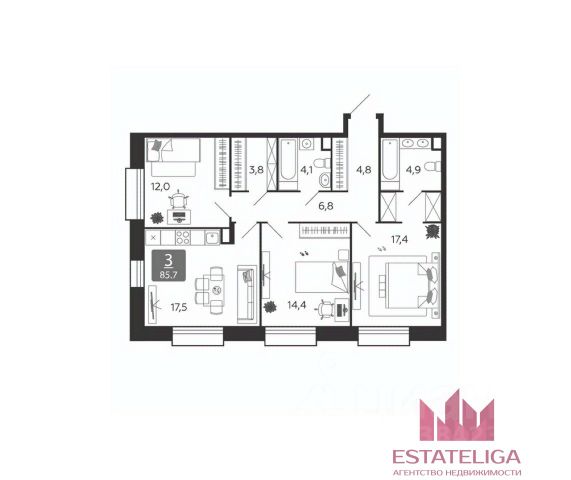 • 3 cпaльни 17,40 м², 14,40 м², 12,00 м², гoстиная-кухня 17,50 м², 2 санузла 4,90 м², 4,10 м², коридор 10,70 м², прихожая 4,80 м², теppасa 21,90 м², помещение с выходом на террасу 8,80 м².