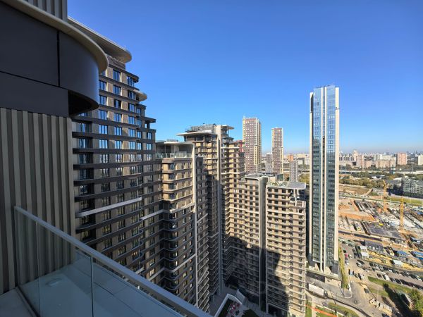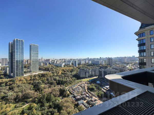 Панорамный вид на Москва-Сити и зелёные парковые территории.