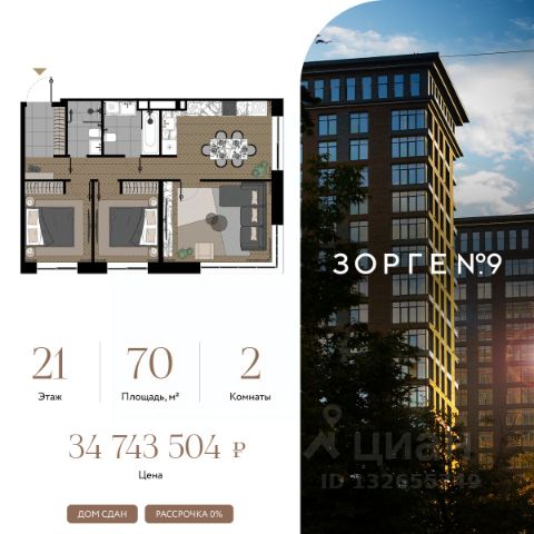 "Зорге 9" — готовые апартаменты бизнес-класса на Ходынке. 10 минут до Москва-Сити. Архитектура: 3 современных корпуса с фасадами в стиле архитектуры Нью-Йорка и с сервисами премиальных отелей, высотой до 23 этажа. Строгие линии, панорамные окна создают ощущение неподдельной роскоши и комфортной жизни в сердце мегаполиса. Проект награжден авторитетной премией European Property Awards. Резиденции: Свободная планировка, небольшая глубина этажа, огромные панорамные окна в пол до 3,6 м и высота потолков до от 3,3 до 4,3 м позволяют реализовать самые смелые концептуальные идеи и создать идеальный интерьер с учетом всех пожеланий. Вдохновляющие виды на город украсят ваш апартамент лучше любой картины. Есть возможность приобретения дизайн-проекта и полной меблировки апартаментов от партнеров девелопера. Расположение: 3 мин. пешком до парка Березовая роща 10 мин. пешком до Ходынского поля 10 мин. до ТЦ Авиапарк 30 минут до Шереметьево 10 мин до Москва-Сити или 1 станция до Москва-Сити 5 минут до ТТК 4 станции метро в шаговой доступности: 6 мин м. Полежаевская (фиолетовая ветка) 7 мин МЦК Зорге (МЦК) 7 мин м. Хорошевская (голубая ветка) 10 мин МЦК Хорошёво (МЦК) Благоустройство: Собственный парк 2 га с амфитеатром и поющими фонтанами. В парке высажено 136 деревьев и более 11 000 кустов и мелких растений из немецких питомников. Площадка для йоги и воркаут-зона со спортивными площадками. Теннисные столы и детский плейхаб Две башни Авторское гранд-лобби В лобби предусмотрена лаундж-зона, чайная с камином, комната для хранения велосипедов и колясок. Доступ по системе FACE ID. В отделке лобби и лифтовых холлов использован декоративный камень итальянского бренда Atlas Concorde Пентхаусы На верхнем уровне комплекса расположены роскошные просторные пентхаусы с высотой потолка до 4,2 метра и панорамными окнами до 3,6 метров, открывающими великолепные виды на столицу. Пентхаусы с выходами на собственные приватные террасы на кровле, площадью от 150 кв. м являются жильем high-уровня, демонстрирующим высокий статус владельца.