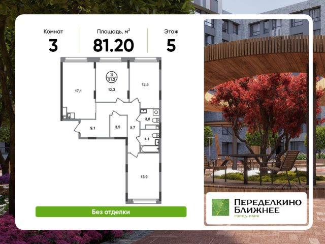 Продается трехкомнатная квартира в городе-парке "Переделкино Ближнее". Общая площадь квартиры - 81,2 кв. м, этаж 5 из 17. Срок сдачи - 3 квартал 2026 года. Тип дома - монолитный. Город-парк "Переделкино Ближнее" расположен в 8 км от МКАД по Боровскому шоссе. ТРАНСПОРТНАЯ ДОСТУПНОСТЬ: - 10 минут пешком до МЦД-4 "Мичуринец" - 15 минут пешком до станции метро "Рассказовка" Солнцевской линии - 10 минут на машине до станции метро "Филатов Луг" Сокольнической линии - 30 минут до центра Москвы - Прямой выезд на дорогу Солнцево-Бутово-Варшавское шоссе, минуя жилую застройку всего ЖК БЛАГОУСТРОЙСТВО: Новая фаза строительства уникальна своим расположением - в шаговой доступности парк на Лукинской улицы, река Алёшинка. На территории 18 фазы строительства будут построены 2 монолитных жилых корпуса повышенного комфорта разной этажности 7, 17 этажей. А также многоуровневый паркинг на 300 м/мест. Вход в жилую часть корпусов каждой секции осуществляется с двух сторон - с наружного контура жилого дома и со стороны дворового пространства, предусмотрен безбарьерный доступ. ВНУТРЕННЯЯ ИНФРАСТРУКТУРА: В рамках данной фазы, для жителей предусмотрено создание пространства, свободного от машин - благоустроенные огороженные дворы с современными детскими и спортивными площадками, разделенными на зоны по возрастам. На территории проекта есть все необходимые объекты социальной и бытовой инфраструктуры: детские сады, школы, магазины, паркинги, аптеки, поликлиники, пожарная часть и др. АВТОРСКИЙ ДИЗАЙН: Современный монолитный дом переменной этажности 7 и 17 этажей. На фасаде предусмотрены корзины для установки кондиционеров. Входные группы домов выполнены по авторскому дизайну. Колясочные располагаются при входе, велопарковка на -1 этаже.