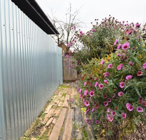 Часть деревянного жилого дома с террасой и верандой. На участке двухкомнатный летний дом, душевой домик, туалет, большой сарай. Участок очищен, скважина законсервирована. Сам участок внутренний, с улицы проход полтора метра, забор из металлопрофиля новый. Рядом лес, магазин.