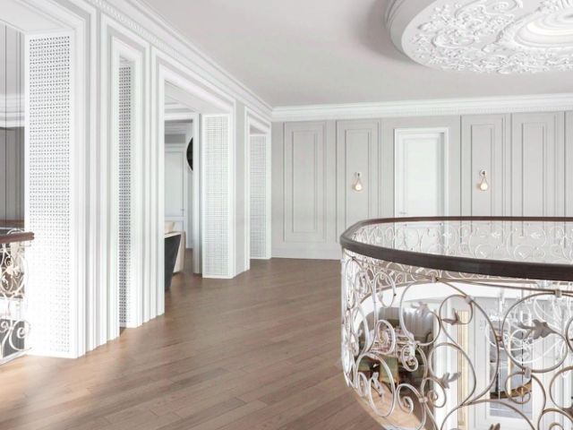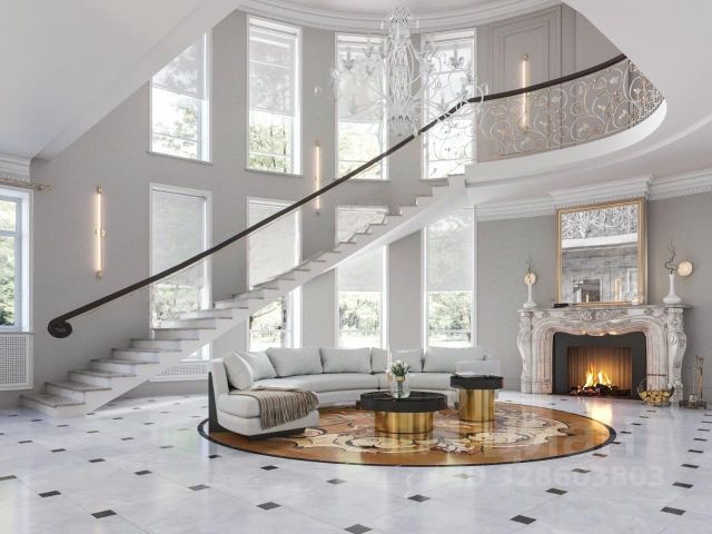 Описание внутренней отделки: модная отделка в стиле Минимализма. Внутри окрашенные однотонные стены, комбинация почти белого и темных цветов, в санузлах керамогранит, имитирующий белый и черный мрамор. В гостиной в зоне ТВ дизайнерская стена-панель 4*3.5м из дуба с 3D-элементами. Полы - по всему дому керамогранит с водяным подогревом. Потолки отделаны гипсокартоном. Двери итальянские из фрезерованного МДФ белого цвета с золоченой фурнитурой и декором, контрастируют с мебелью черного цвета. Входная дверь с электронной защелкой и большой ручкой, с терморазрывом и вставкой из стеклопакета с закаленным стеклом. Сантехника премиальных европейских брендов (TECE, Roca, IDDIS, HansGrohe). Хамам отделан мозаикой..