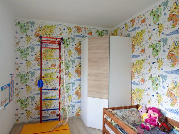 *спальня 8 м.кв. (детская комната с тематическими обоями, на полу ламинат 33 класса),