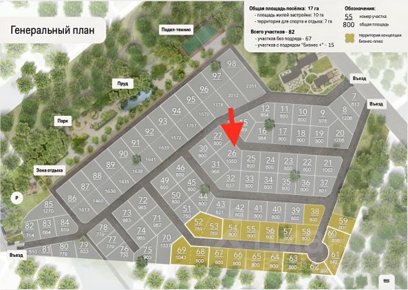 Продается участок площадью 10,5 сотки, No 26 на схеме поселка.