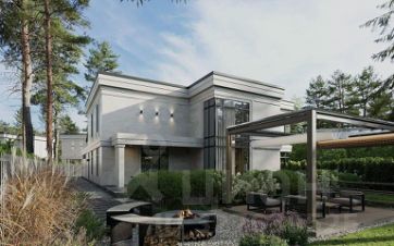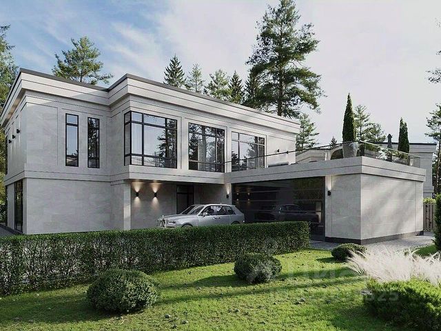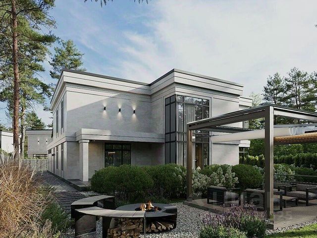 На участке - отдельно стоящий гараж на 6 машиномест, помещение охраны, хозяйственный блок и квартира для персонала. Простор позволяет разместить террасы, зоны барбекю, бассейн и прогулочные маршруты. Ландшафт выполнен с учётом приватности и видов на зелёный массив.