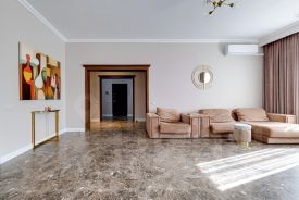 Парадная зона встречает высоким потолком, вторым светом и панорамными окнами с видом на парк. В центре гостиной - мраморное панно из итальянского камня, уложенное в раскладке "бабочка" - скульптурный акцент, задающий тон всему интерьеру, а также, не менее прекрасное украшение гостиной - акустический рояль SCHIMMEL. Мебель - Ulivi MAX и Minotti Horizonte, Baxter Calix, Minotti Song, Rugiano Decoro, аксессуары Bosa, Smania, Gallotti&Radice. Кухня объединена с обеденной зоной, дополнена барной стойкой и подвесами Gubi Multi-Lite. Также на этаже: кабинет с библиотекой (Emmemobili, Rugiano), гостевая спальня, парикмахерская, гардеробные, технические помещения, SPA-комплекс с бассейном, сауной, хаммамом, душевыми и раздевалками.