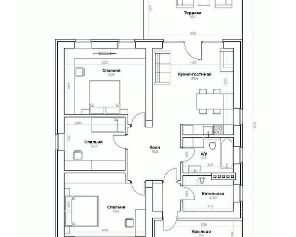 1 спальня 14,5 кв.м. Сан.узел. Гостиная с дровяным камином 33 кв.м. Кухня-столовая 30 кв.м. Котельная. Прихожая. Большая терраса, по двум сторонам дома..