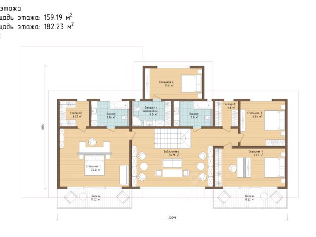 2-й этаж: Библиотека, гардеробная, спальня, санузел, лестничный холл, гардеробная, коридор, санузел, хозяйская спальня, коридор, служебная лестница, спальня, гардеробная, санузел, гардеробная, санузел, спальня, спальня, санузел, гардеробная, санузел, спальня
