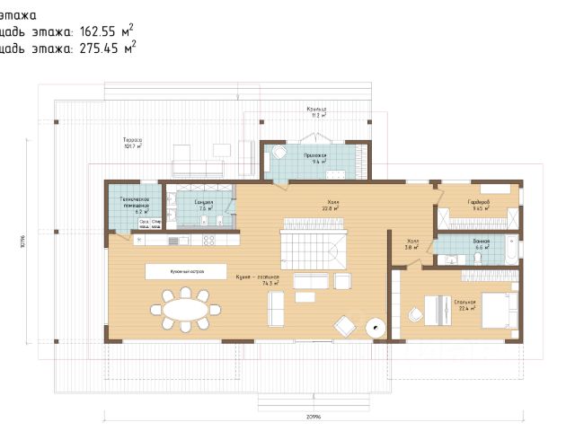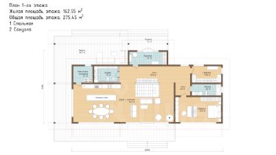 1-й этаж: Гостиная, Прихожая, Гостевой санузел, Гардеробная, Лестничный холл, Кабинет, Гардеробная, Санузел, Коридор, Гостевой санузел, Гардеробная, Парикмахерская, Кухня, Техническое помещение, Гардеробная, Спальня, Санузел, Коридор, Служебная лестница, Раздевалка, Санузел, Душевая, Сауна, Хамам, Бассейн, Гардеробна