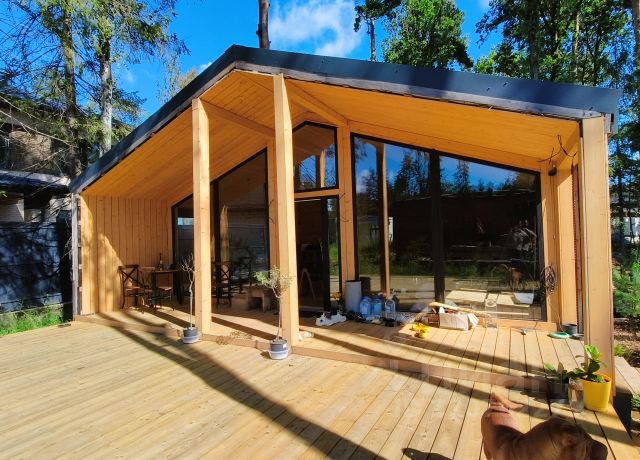 Кровля покрыта глиняной черепицей, срок службы которой не менее 50 лет. К дому пристроена летняя веранда с печью, выход на которую организован через кухонную зону.