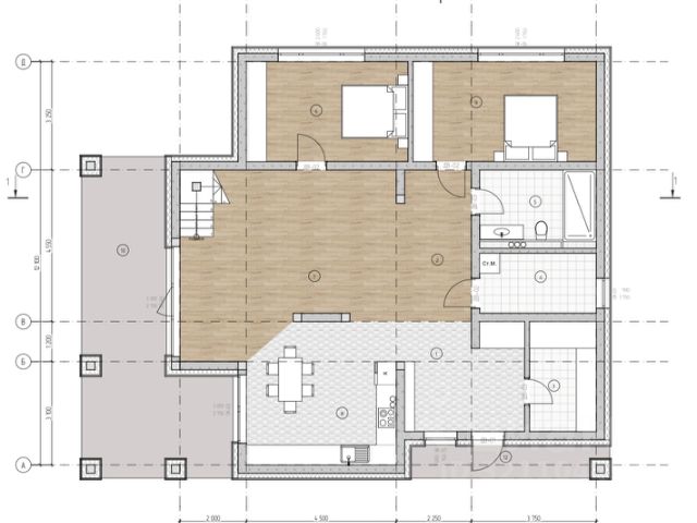 - Первый этаж: гостиная-столовая, кухня, санузел, спальня, кабинет, спа-зона, гараж, веранда;