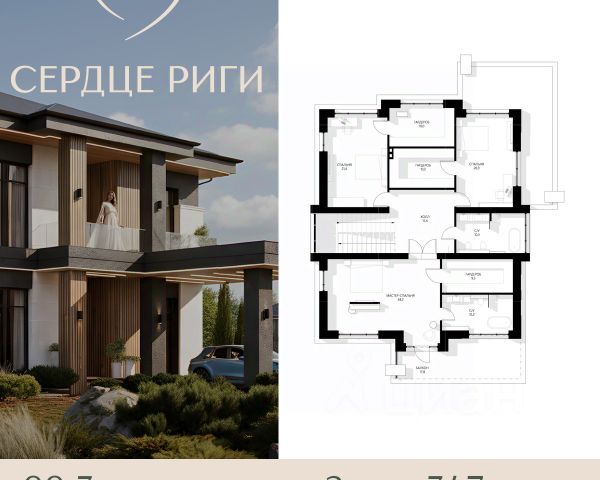Мастер-блок: спальня (35,2) с выходом на собственный балкон (25), ванная комната (14,7), с/у (3,6), две гардеробные (26,7 и 14,7).