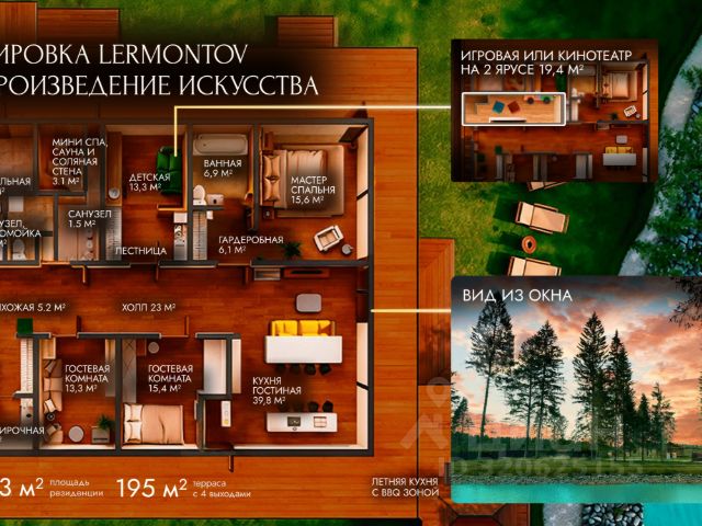 Премиум вилла LERMONTOV в стиле шале фахверк 373,1 м² на участке 16,4 соток с вековыми елями и личной акваторией 3,6 сотки в КП Ели Estate, Пятикратном победителе премии Поселок Года. ЗВОНИТЕ или НАПИШИТЕ свой номер телефона в Циан сообщениях и Вы получите: презентацию дома, планировку, генплан посёлка, консультацию и ответы на ваши вопросы от эксперта поселка. В доме: 4 спальни с собственными удобствами, детская с игровой-кинотеатром на 2 ярусе, холл вдоль всего дома на 23 м², просторная кухня-гостиная на 39,8 м² с видом на каскад прудов, мини спа, сауна и соляная стена, постирочная и котельная. Особенности: 195 м² терраса с 4 выходами, панорамные окна в пол по всему периметру дома, 5 метров высота потолков в коньке кровли, пожизненная гарантия и сервисное обслуживание, система умный дом позволяет управлять виллой на месте и удаленно. 8 вековых елей и ландшафт из 100+ деревьев на участке, собственный выход к воде, летняя кухня, пирс, барбекю и костровая зона. Уличное освещение по 8 сценариям. Зеленая изгородь из туй, елей и кедров. ПЛАНИРОВКА Общие помещения: терраса с 4 выходами (195), кухня гостиная (39,8), холл (23), мини спа, сауна, соляная стена и санузел (4,6), прихожая (5,2), санузел, лапомойка (3,2) Технические помещения: котельная (5,1), постирочная (5,4). Мастер-блок: спальня 1 (15,6) с гардеробной (6,1) и ванной комнатой (6,9) Детская (13,3) c игровой-кинотеатром на 2 ярусе (19,4) Спальня 2 (15,4) Спальня 3 (13,3) МАТЕРИАЛЫ И БРЕНДЫ Окна: Gmax, TopLT, Vision Light. Сантехника: Grocenberg, Ceramica Nova, Bettoserb, Abber. Кухня: кухонная мебель по индивидуальному заказу, столешницы из дуба, оникса и карагача, кухонный остров из керамогранита, оникса и слеба карагача. Бытовая техника: винный шкаф, посудомоечная машина, духовой шкаф, СВЧ и холодильник Bosch, паровой шкаф, 5 телевизоров, проигрыватель для пластинок, проектор, телескоп. ИНЖЕНЕРИЯ И КОММУНИКАЦИИ Все инженерные системы премиум марки REHAU, индивидуальный проект всей инженерии с управлением по QR коду. 151,1 м² общая площадь теплых полов с системой обогрева REHAU. Вилла оснащена системами: рекуперации(сохранения тепла), приточно-вытяжной вентиляции, увлажнения, кондиционирования, охлаждения, обеспыливания, управление микроклиматом по индивидуальному проекту. О ПОСЕЛКЕ Ели Estate — это клубный эко-поселок в 60 мин от МКАД по Новой Риге и скоростной М-11 "Нева", X5 победитель премии Поселок года, признан самым экологичным в России. 12 ГА инфраструктуры: Каскад прудов 1,5 ГА, Песочный пляж, Теннисный корт, Вертолетная площадка, Продуктовый магазин, Фермерский мини рынок, Банный комплекс, Корт для сквоша и падел тенниса, Клабхаус, Детский игровой комплекс, Фитнес клуб, Workout зона, Клаб хаус, Пруд для рыбалки, Костровая зона. ЗВОНИТЕ или НАПИШИТЕ свой номер телефона в Циан сообщениях и Вы получите: презентацию дома, планировку, генплан посёлка, консультацию и ответы на ваши вопросы от эксперта поселка! Купить большой коттедж Ленинградское шоссе.