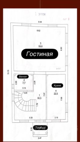1 этаж; комната отдыха, баня, джакузи, душевая, су, котельная, техническое помещение, гараж на 2 м/м