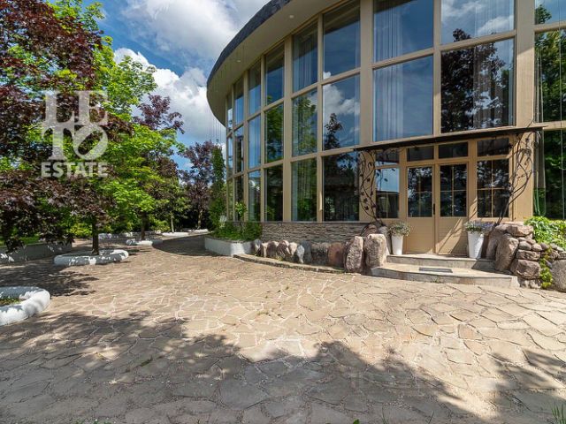 На участке правильной прямоугольной формы, площадью 60 соток, сделаны ландшафтный дизайн, дренаж и ливневстоки. На территории также расположены оранжерея с квартирой для персонала (площадь 150 кв м), гараж (98 кв м) для 2-х автомобилей, большая беседка и вольер для собак.